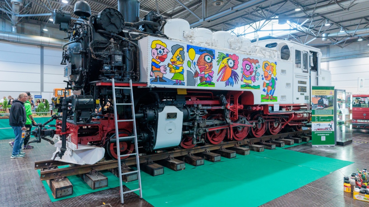 Knallig bunt und einzigartig – das sind die markanten Pop-Art-Werke von Michael Fischer-Art. Der Künstler aus Leipzig hatte letztes Jahr einen großen Auftritt auf der Hobbymesse Leipzig. Innerhalb weniger Stunden bemalte er die historische Lok der Dampfbahnroute Sachsen, die vorher schon in ihrem kreideweißen Fotografieranstrich ein Hingucker war. Der Clou: Weil Fischer-Art seine Werke nicht direkt auf die Lok malte, sondern auf Magnetfolien, die an der Lok angebracht waren, konnten wir die Kunstwerke ohne Probleme abnehmen und sichern.