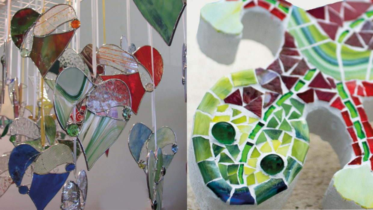 Beim Workshop „Glasmosaik“ wird das Glas eigenständig geschnitten und aus den einzelnen Scherben farbenfrohe Mosaik-Objekte gestaltet. Die Auswahl an Gläsern ist riesig und jeder darf komplett selbst ans Werk und nach seinen Vorlieben schalten und walten. Wer mehr davon möchte, kann alle Objekte auch als Bausatz für die Hobbywerkstatt erwerben.