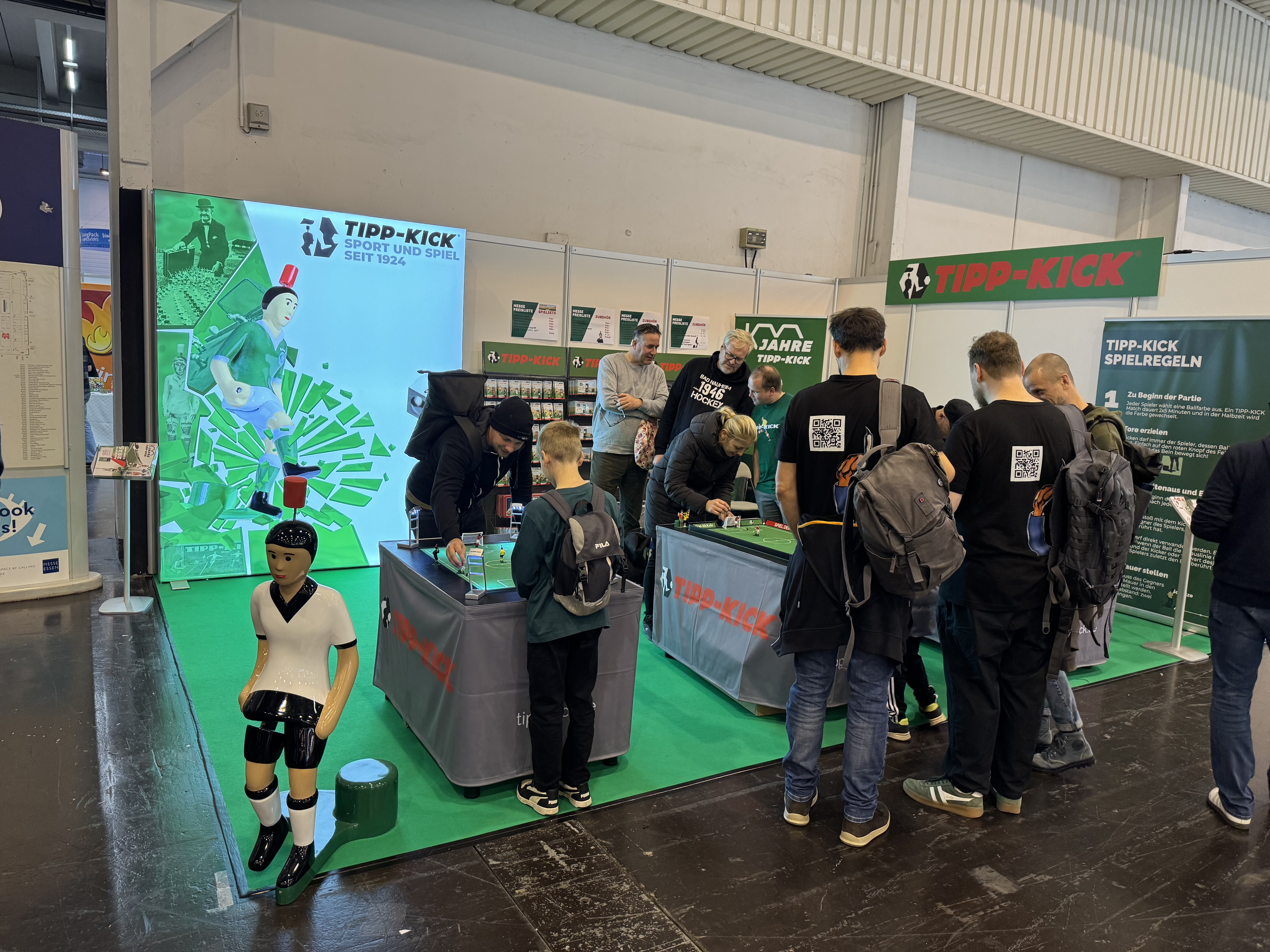 Am Tipp-Kick Stand wird gekickt, aber so richtig nicht mit dem Fuß, aber mit Köpfchen und Geschick probiere dich aus und messe dich mit deinen Freunden oder der Familie. Selbst nach 100 Jahren gibt es noch immer neu Strategien zu Endecken. Das Spielprinzip von TIPP-KICK ist einfach: Jeder Spieler wählt zum Start der Partie eine Farbe des schwarz-weißen Balls aus. Die Farbe, die in einer Spielsituation oben liegt, entscheidet welcher Spieler an der Reihe ist. Mit einem Knopfdruck auf die Metallfigur wird der Ball geschossen und Tore erzielt. Das Match gewinnt…..